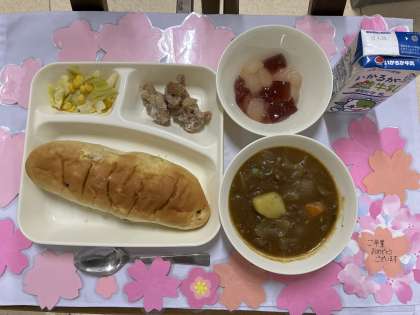 「フライドチキン、キャベツとコーンのサラダ、カレーシチュー(米粉)フルーツゼリー、おさつパン、牛乳」です。