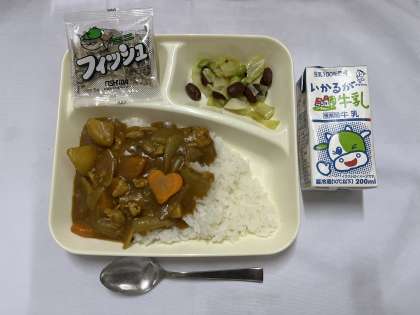 「チキンカレーライス(米粉)、ビーンズサラダ、ミニフィッシュ、牛乳」です。