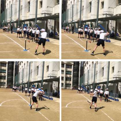 午前中、暖かな陽射しのもと4年生がティーボールを楽しんでいます。