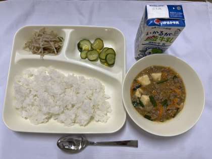 「マーボーどうふ、きゅうりとコーンの甘酢あえ、もやしとピーマンのごまいため、ごはん、牛乳」です。