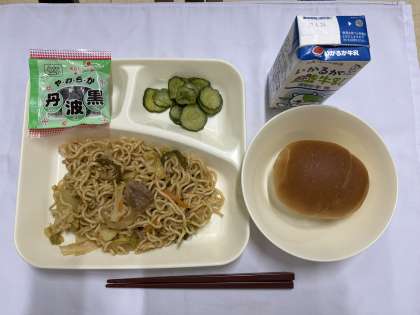 「焼きそば、きゅうりのしょうがづけ、ソフト黒豆、黒糖パン、牛乳」です。