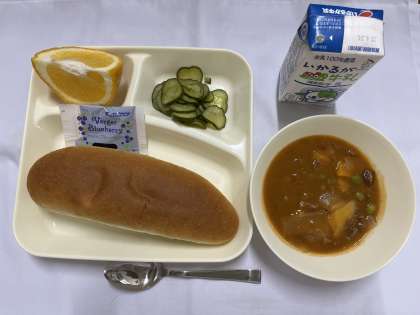 「ビーフシチュー、きゅうりのサラダ、あまなつかん、コッペパン、ブルーベリージャム、牛乳」です。