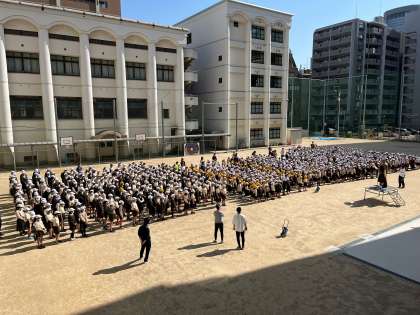 初めて 全校児童が運動場に集まって、全校児童朝会が行われました。