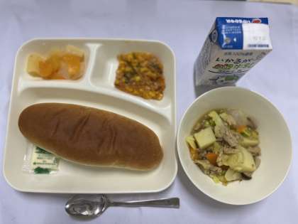 「豚肉と野菜のカレースープ煮、変わりピザ、ミックスフルーツ(缶)、コッペパン、マーガリン、牛乳」です。