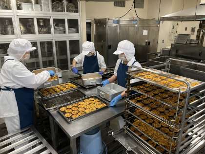 給食の「変わりピザ」は、ギョウザの皮に、ピーマン、コーン、ツナ缶、をのせて、焼き物機で焼いて作っています。