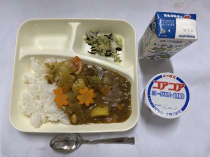 「牛肉と大豆のカレーライス、キャベツのひじきドレッシング、ヨーグルト、牛乳」です。