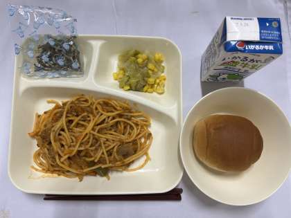 「ミートスパゲティ、レタスとコーンのサラダ、ミニフィッシュ、黒糖パン、牛乳」です。