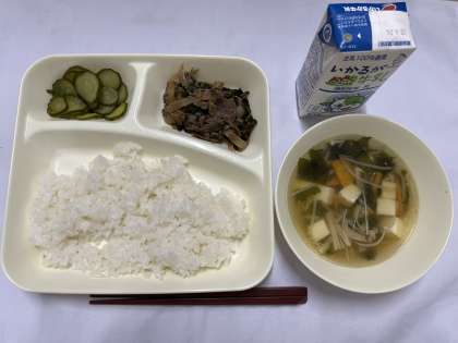 「プルコギ、きゅうりの甘酢づけ、とうふとわかめのスープ、ごはん、牛乳」です。