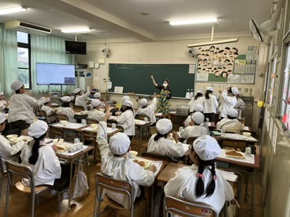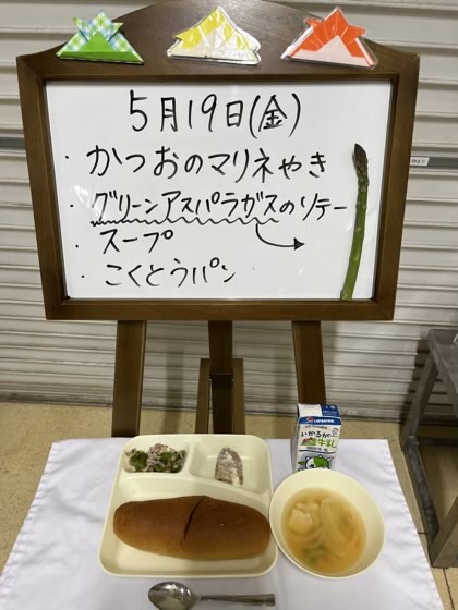 「かつおのマリネ焼き[ノンエッグドレッシング]、グリーンアスパラガスのソテー、スープ、黒糖パン、牛乳」です。
