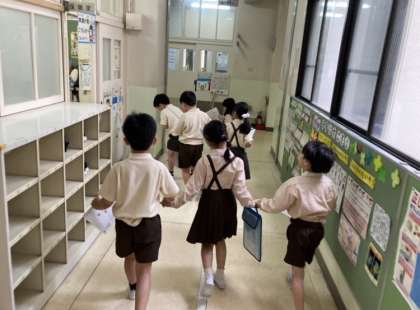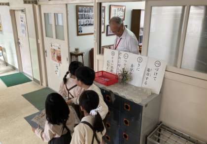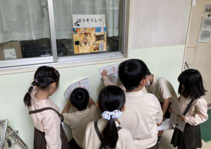 2年生が、1年生に学校を案内しました。図書室や保健室等の各教室に案内し、どんなことをする教室なのか説明しました。やさしく声をかける姿もあり、立派な2年生でした。