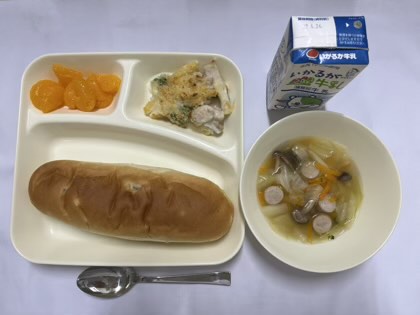 「マカロニグラタン、キャベツのスープ、みかん(缶)、おさつパン、牛乳」です。
