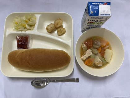 「いかてんぷら、キャベツとコーンのソテー、コッペパン、いちごジャム、牛乳」です。