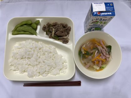 「チンジャオニューロウスー、ハムと野菜の中華スープ、枝豆、ごはん、牛乳」です。