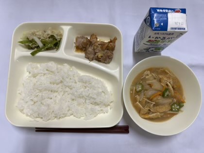 「鶏肉のしょうゆバター焼き、野菜いため、みそ汁、ごはん、牛乳」です。