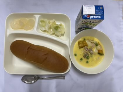 「かぼちゃのクリームシチュー、キャベツのゆずドレッシング、和なし(カット缶)、黒糖パン、牛乳」です。