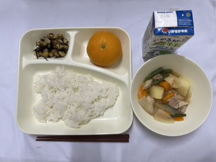 「鶏肉と野菜の煮物、ひじき豆、冷凍みかん、ごはん、牛乳」です。