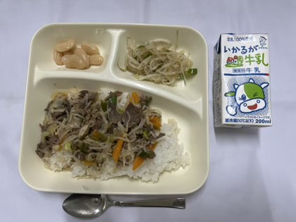 「牛丼、もやしとピーマンのごまいため、大福豆の煮物、牛乳」です。
