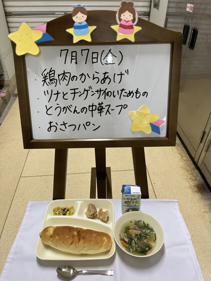 「鶏肉のからあげ、ツナとチンゲンサイのいためもの、とうがんの中華スープ、おさつパン、牛乳」です。