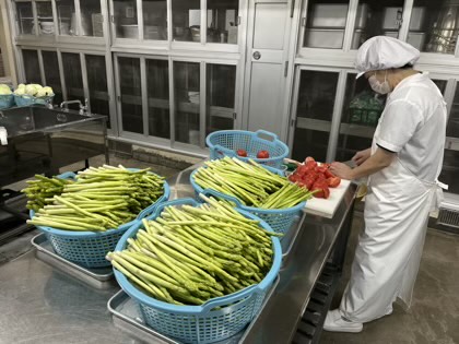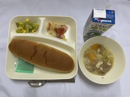「鶏肉とてぼ豆のスープ煮、じゃがいもとトマトのチーズ焼き、グリーンアスパラとコーンのサラダ、コッペパン、りんごジャム、牛乳」です。