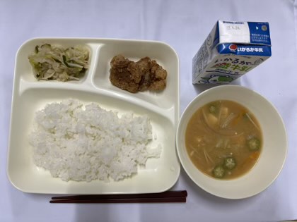 「豚肉のたつたあげ、切干しだいこんのゆずの香あえ、みそ汁、ごはん、牛乳」です。