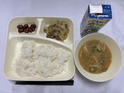 「豚肉の甘辛焼き、金時豆の煮物、とうがんのみそ汁、ごはん、牛乳」です。