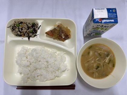 「赤魚のおろしじょうゆかけ、高野どうふのいり煮、みそ汁、ごはん、牛乳」です。