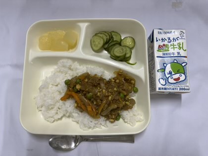 「大豆入りキーマカレーライス(米粉)、きゅうりのサラダ、洋なし(缶)、牛乳」です。