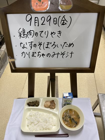 「鶏肉の照り焼き、なすのそぼろいため、かぼちゃのみそ汁、ごはん、牛乳」です。