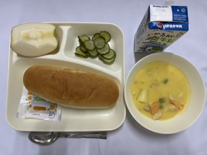 「豆乳コーンクリームシチュー(米粉)、きゅうりのバジル風味サラダ、りんご、コッペパン、アプリコットジャム、牛乳」です。
