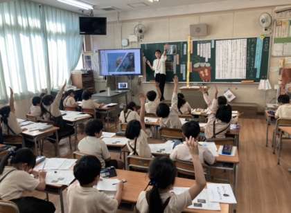 校内授業研究会で、2年生が国語「ビーバーの大工事」を学習をしました。本文からビーバーのすごいところを見つけ、交流しました。
