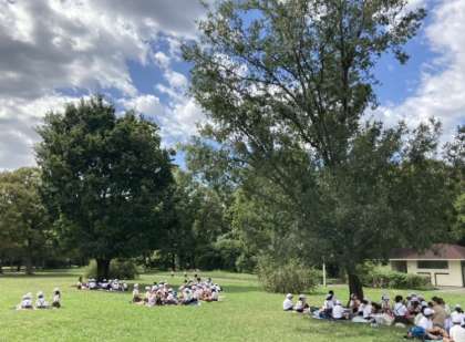 お弁当タイム。緑に囲まれて、外で食べるお弁当は格別です。