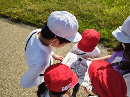 地図を片手にオリエンテーリングです。道に迷いながら6年生がリードします。