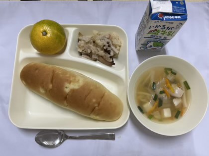 「金時豆の中華おこわ、中華スープ、みかん、おさつパン、牛乳」です。