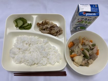 「豚肉のねぎじょうゆ焼き、きゅうりの甘酢づけ、ふきよせ煮、ごはん、みそ汁、牛乳」です。
