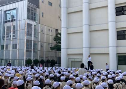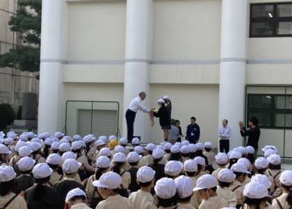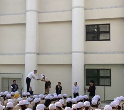 先週行った1・6年生の遠足で、6年生のやさしい関わりがとてもよかったと校長先生からお話がありました。また昨日あった北区民カーニバルで準優勝した800mリレー、キックベースの表彰をしました。