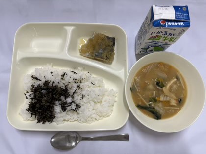 「さごしのみぞれかけ、みそ汁、牛ひじきそぼろ、ごはん、牛乳」です。