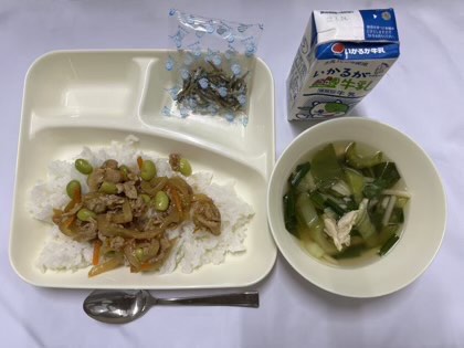 「ピリ辛丼、中華スープ、ミニフィッシュ、牛乳」です。