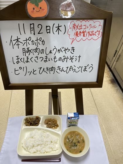 「体ポカポカ豚肉のしょうが焼き、ピリッとひき肉きんぴらごぼう、ほくほくさつまいものみそ汁、ごはん、牛乳」です。