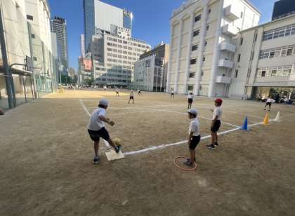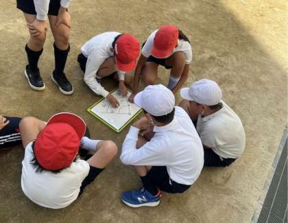 体育の学習でキックベースボールに取り組んでいます。ボードで守備の作戦を立て、攻撃では力強くキックをしています。勝利をめざし、打順や蹴り方をチームで工夫しています。