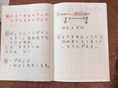 1年生で算数の授業研究を行いました。今日の学習は「被加数<加数の場合の繰り上がりのある加法の計算ができるようになる」です。