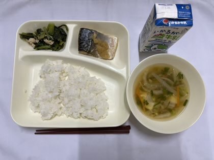 「さばのみぞれかけ、小松菜の煮びたし、すまし汁、ごはん、牛乳」です.