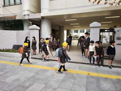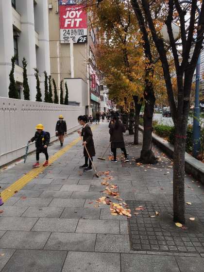 登校時、玄関前では、清掃活動やあいさつ運動に自主的に取り組んでいます。6年生の取組が他学年へと広がり、元気いっぱいです。