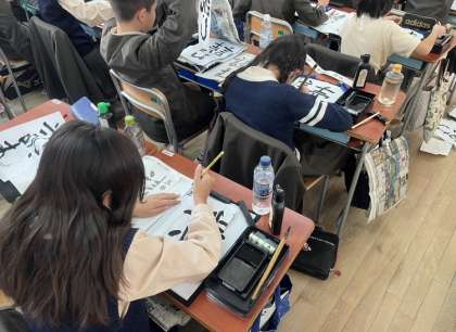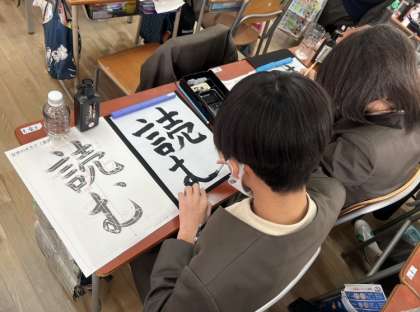 毛筆では、「読む」の漢字とひらがなの大きさに注意して集中して書きました。
