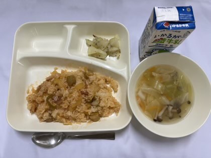 「ケチャップライス、じゃがいものバジル焼き、スープ、牛乳」です。