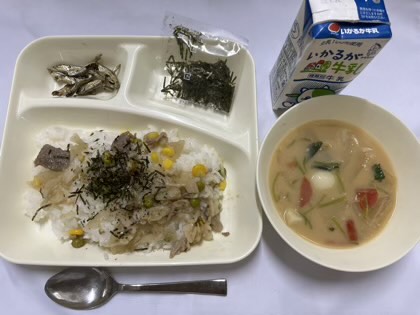 「れんこんのちらしずし、ごまめ、ぞうに、牛乳」です。
