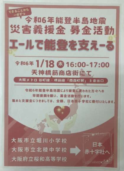 能登半島地震により被害に遭われた方々への早期復興を願い、桜和高等学校・北稜中学校・堀川小学校の3校合同で募金活動を行います。集めた支援金につきましては、全額、日本赤十字社に寄付いたします。