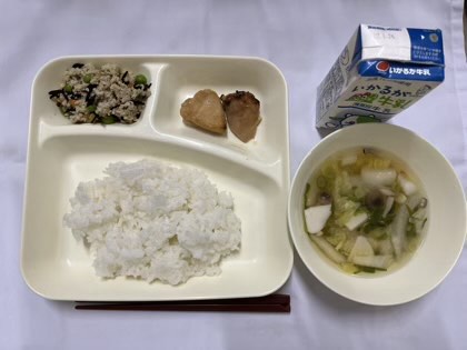 「鶏肉の甘みそやき、高野豆腐のいり煮、五目汁、ごはん、牛乳」です。