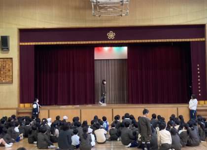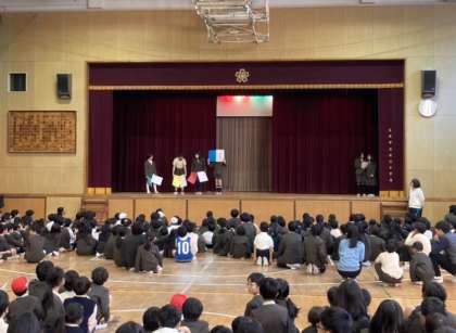 講堂で「いくつとおったでしょう?」を行いました。幕の間を通った人数、上着を着ている人数、帽子をかぶっている人数を集中して数え、楽しみながら活動しました。