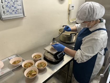 調理員さんが、親子丼のたまごをぬいたものを、卵アレルギー児童用に作ってくれています。