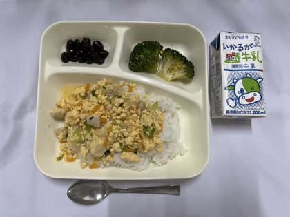「親子丼、ブロッコリーのごまあえ、黒豆の煮物、牛乳」です。